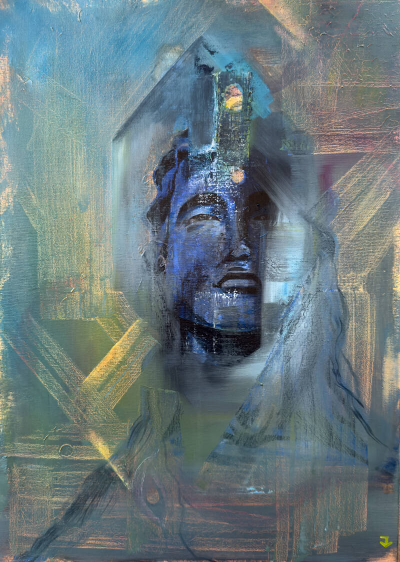 Dit schilderij had tijd nodig. Maandenlang staarde het gezicht van Shiva, de vernietiger van het kwaad, me aan in mijn woonkamer. Ik had het op een dag nageschilderd van een afbeelding die ik bij toeval ergens tegenkwam, en had daar mijn eigen draai aan gegeven. Daarna kwam het lange tijd stil te liggen in een soort tussenfase: Hij had alleen nog een geel-oranje achtergrond en was duidelijk nog niet af. Maar ik wist niet wat ik ermee moest, hoe het verder moest met dit doek. En het bleef me maar aanstaren.