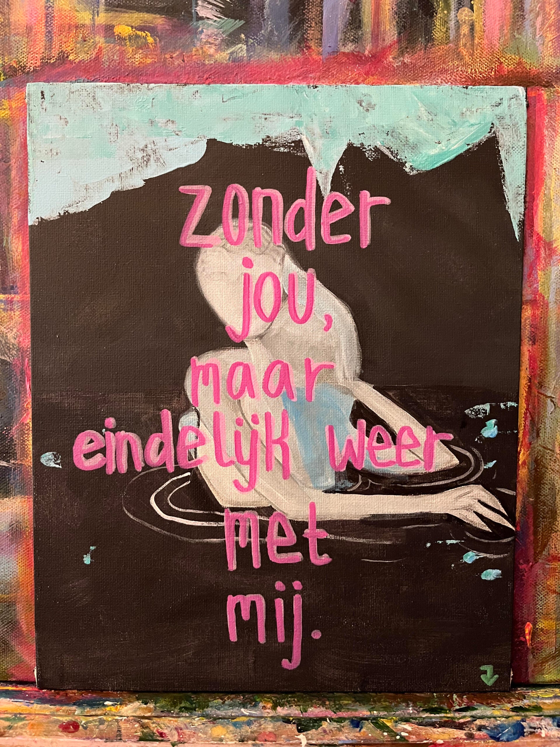 Elke tekst is zelf bedacht, elk schilderijtje zelf geschilderd. Je ontvangt altijd het originele werk, tenzij je om maatwerk vraagt. De teksten zijn soms op zichzelf staande quotes, soms stukjes van mijn gedichten (zie Poëzie, of ga naar mijn Instagram).